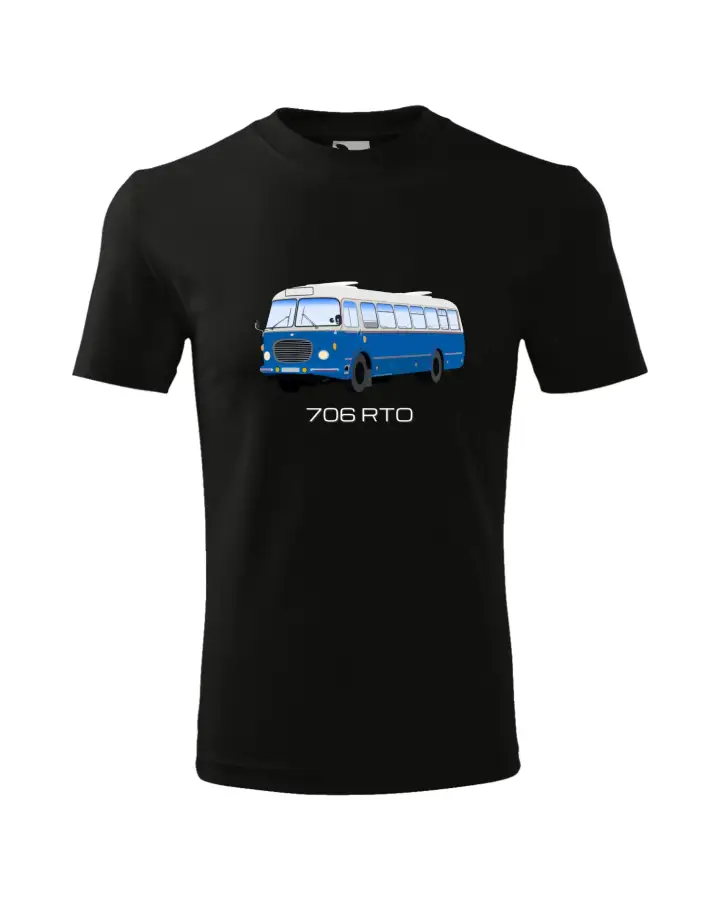 Tričko s ceněným veteránem i legendou mezi evropskými autobusy – vozem Škoda 706 RTO – „erťákem“. V modrém provedení karoserie, tak, jak tyto vozy jezdily v DPMG.